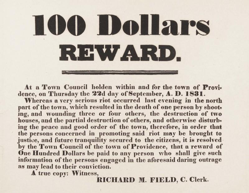 The Snow Town race riot lasted from September 21-24, 1831, resulting in five deaths and property damage. Concerned by the level and duration of civil unrest, the Providence Town Council offered a reward for information leading to the conviction of responsible parties. The Snow Town Riot was the catalyst in the transition of the town into a city creating a city government with strong police powers. Prior to the riot, in the absence of a police force, the militia had to be called in during serious matters.