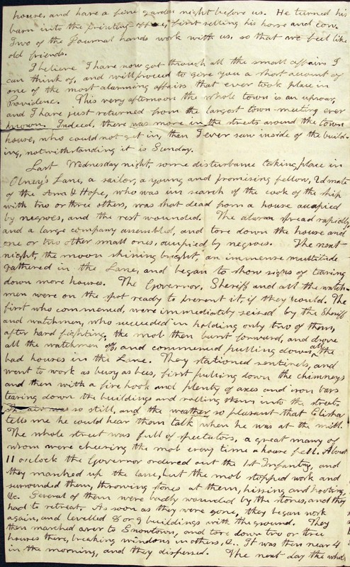 Last Wednesday night, some disturbance taking place in Olney’s Lane, a sailor, a young promising fellow, 2d mate of the Ann & Hope, who was in search of the cook of the ship with two or three others, was shot dead from a house occupied by negroes, and the rest wounded. The alarm spread rapidly, and a large company assembled, and tore down the house and one or two other small ones, occupied by negroes. The next night, the moon shining bright, an immense multitude gathered in the Lane, and began to show signs of tearing down more houses. The Governor, Sheriff and all the watchmen were on the spot ready to prevent it, if they could. The first who commenced, were immediately seized by the Sheriff and watchmen, who succeeded in holding only two of them, after hard fighting; the mob then burst forward, and drove all the watchmen off, and commenced pulling down all the bad houses in the Lane. They stationed sentinels, and went to work as busy as bees, first pulling down the chimney, and then with a fire hook and plenty of axes and iron bars tearing down the buildings and pulling them into the streets. The air was so still, and the weather so pleasant that Elisha tells me he could hear them talk when he was at the mill. The whole street was full of spectators, a great many of whom were cheering the mob every time a house fell. About 11 o’clock the Governor ordered out the 1st Infantry, and they marched up the Lane, but the mob stopped work and surrounded them, throwing stones at them, hissing and hooting, &c. Several of them were badly wounded by the stones, and they had to retreat. As soon as they were gone, they began work again, and leveled 8 or 9 buildings with the ground. They then marched over to Snowtown, and tore down two or three houses there, breaking windows in others. It was then near 4 in the morning, and they dispersed.